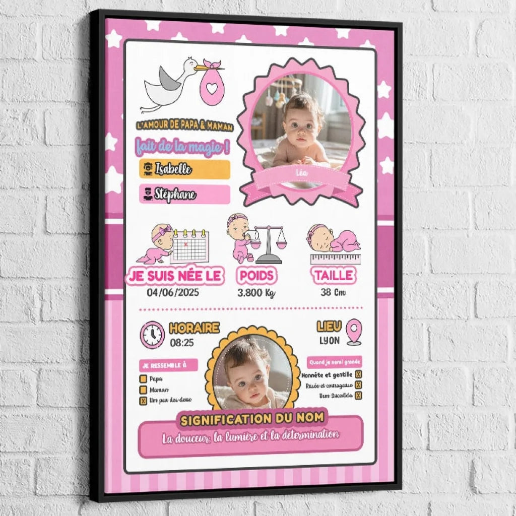 Faites de la naissance de votre petite fille un moment gravé pour toujours grâce à ce tableau unique, conçu pour allier élégance et émotion. Commandez dès aujourd’hui et recevez un souvenir qui vous accompagnera toute votre vie.