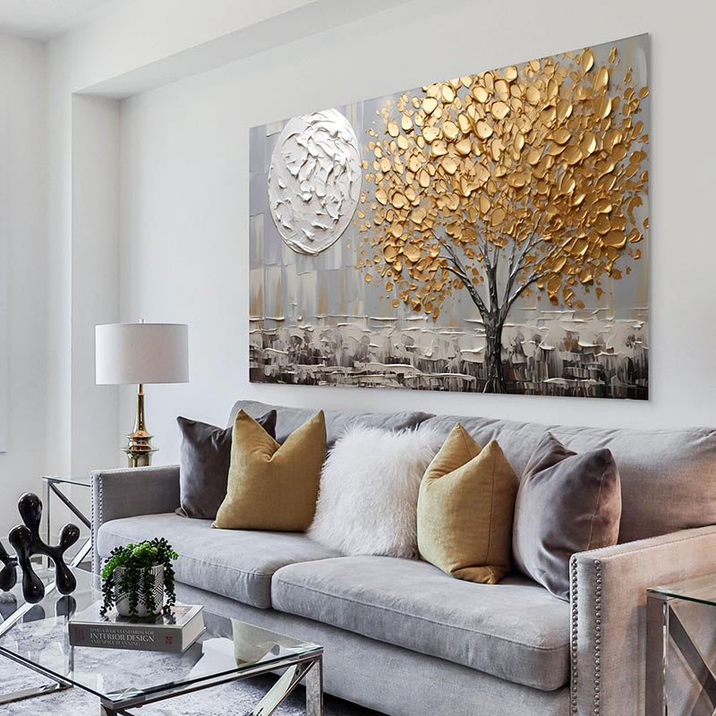 - Élégance et Simplicité : La combinaison de l'arbre doré et du fond lunaire crée une harmonie visuelle qui est à la fois simple et sophistiquée. C'est une œuvre qui attire le regard sans être trop imposante.