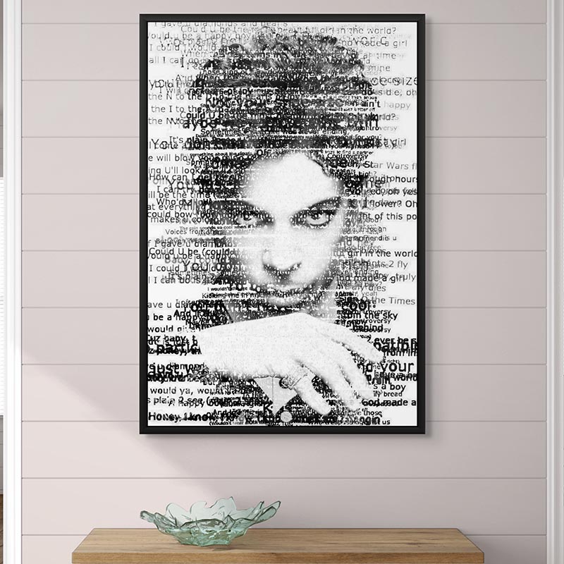 Le style typographique de ce tableau fait toute son originalité. Le portrait de Prince semble surgir des mots, créant une œuvre abstraite qui attire à la fois par sa profondeur visuelle et sa signification textuelle. La précision des détails, mêlée à la composition des mots, en fait une pièce à la fois artistique et conceptuelle qui captera instantanément l'attention de vos invités.