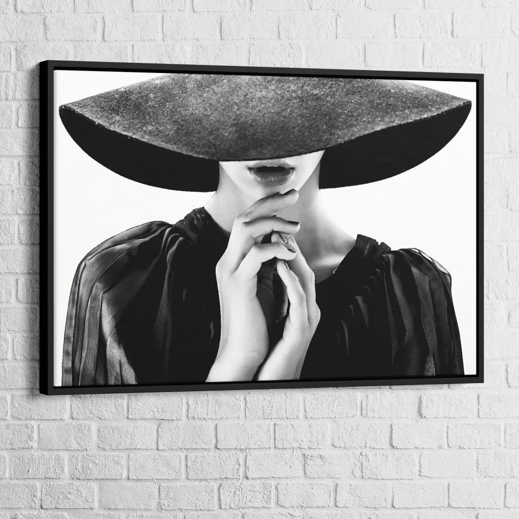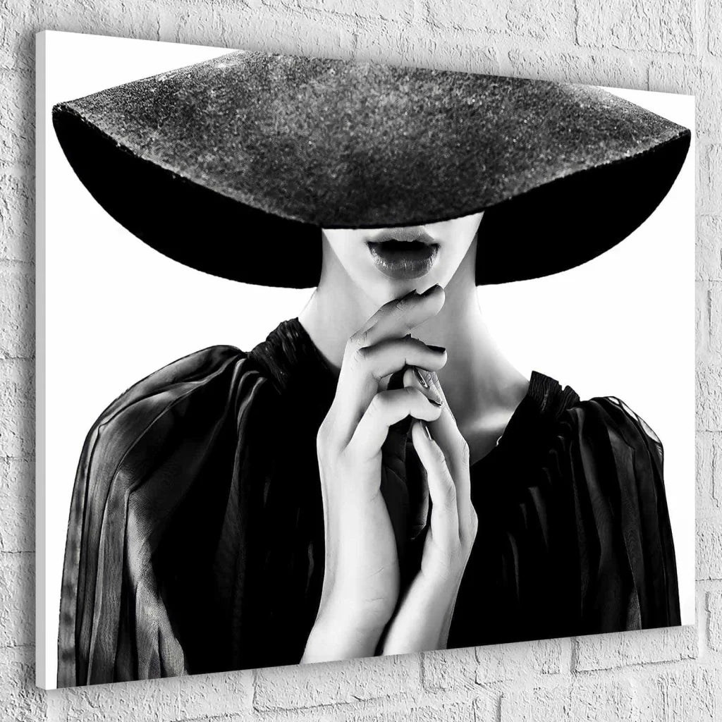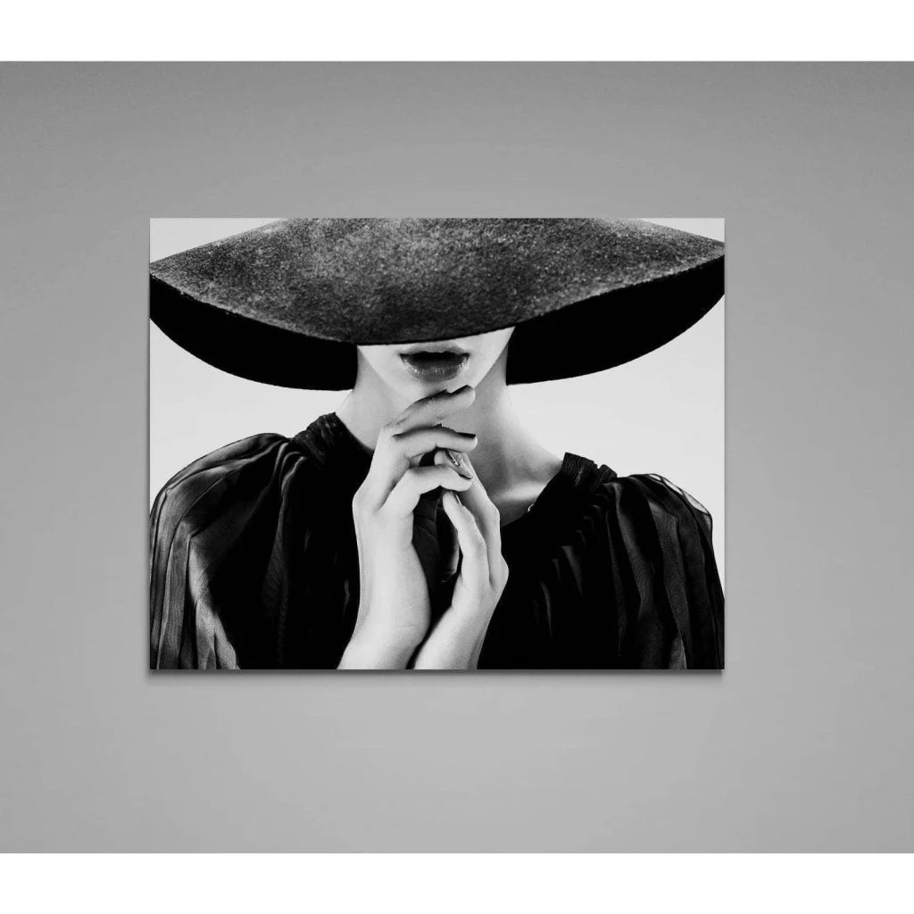 Ce joli tableau affichant le portrait d’une femme offre son élégance, son charme et une touche d’humour. Le visage masqué par le grand chapeau semble mystérieux, fascinant. L’image met en valeur la beauté féminine, les mains douces et les lèvres pulpeuses. Elle semble apporter de la chaleur humaine. Noir et blanc, le tableau présente peu de détails et d’éléments. En y jetant un regard, vous resterez concentré sur le visage de la femme et sur son charme.