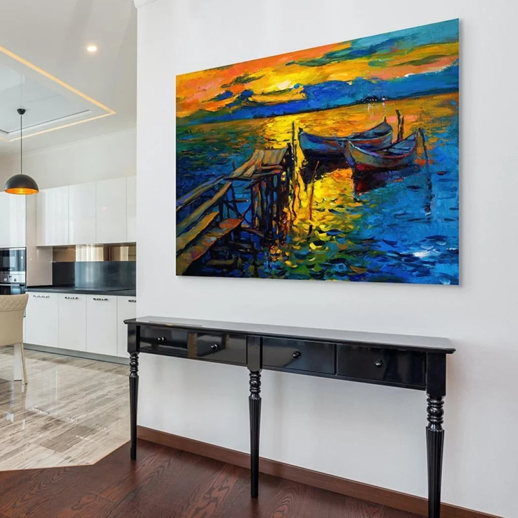 Votre salon mérite une pièce maîtresse qui attirera l’attention tout en apportant une sensation de bien-être. Ce tableau XXL est conçu pour les amateurs de décorations contemporaines et colorées. Les nuances lumineuses du coucher de soleil reflétées sur l'eau calment l'esprit tout en offrant une explosion de couleurs vibrantes. Que vous ayez un intérieur moderne ou plus classique, ce tableau ajoutera une touche dynamique et artistique à votre espace.