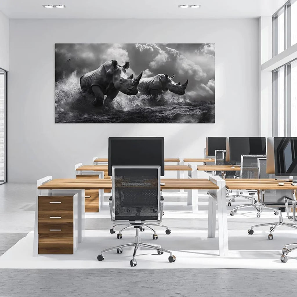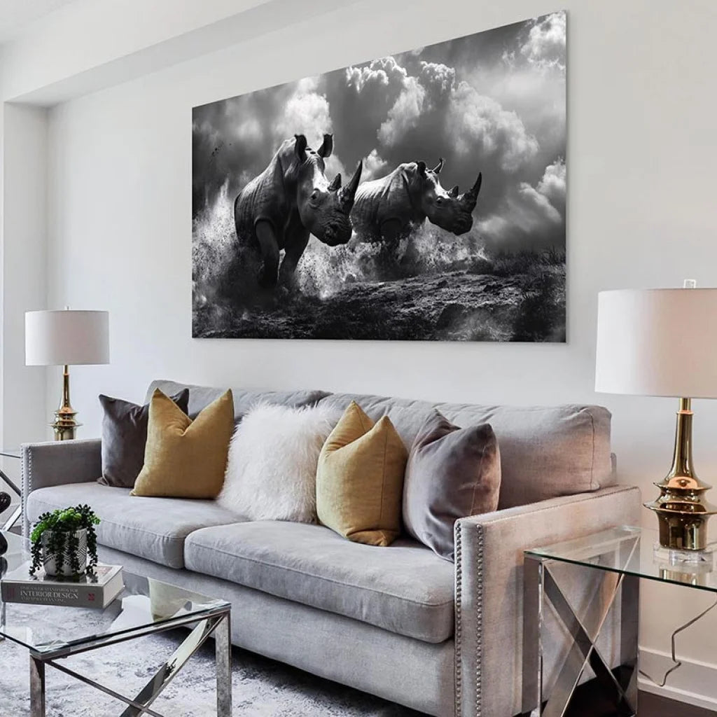 Grâce à ses dimensions imposantes et à la force visuelle de la scène, "Rhinocéros – La Charge" devient rapidement le point central de votre pièce. Que ce soit dans un salon, une chambre ou un bureau, ce tableau ne passera pas inaperçu.