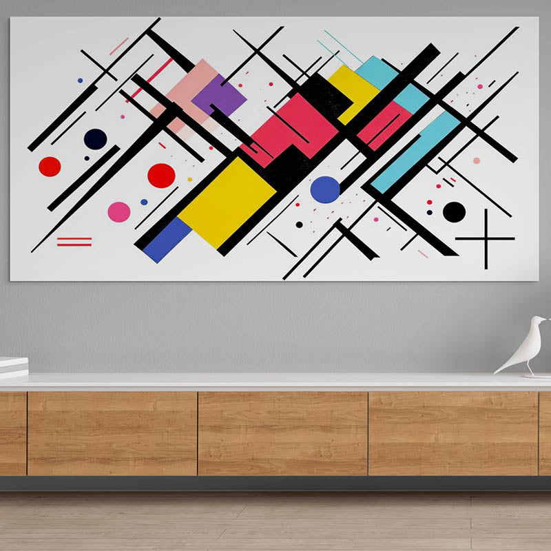 "Lines in Motion" on juhla abstrakti geometria ja jotkut kromaattisia kontrasteja. Leikkaavat mustat viivat luovat rakenteen tunteen, kun taas päävärien ponnahdukset – keltainen, sininen, punainen – ja pastellisävyt tuovat ainutlaatuista energiaa. Jokainen yksityiskohta on suunniteltu kiinnittämään huomiota ja tuomaan visuaalista syvyyttä tilaan.