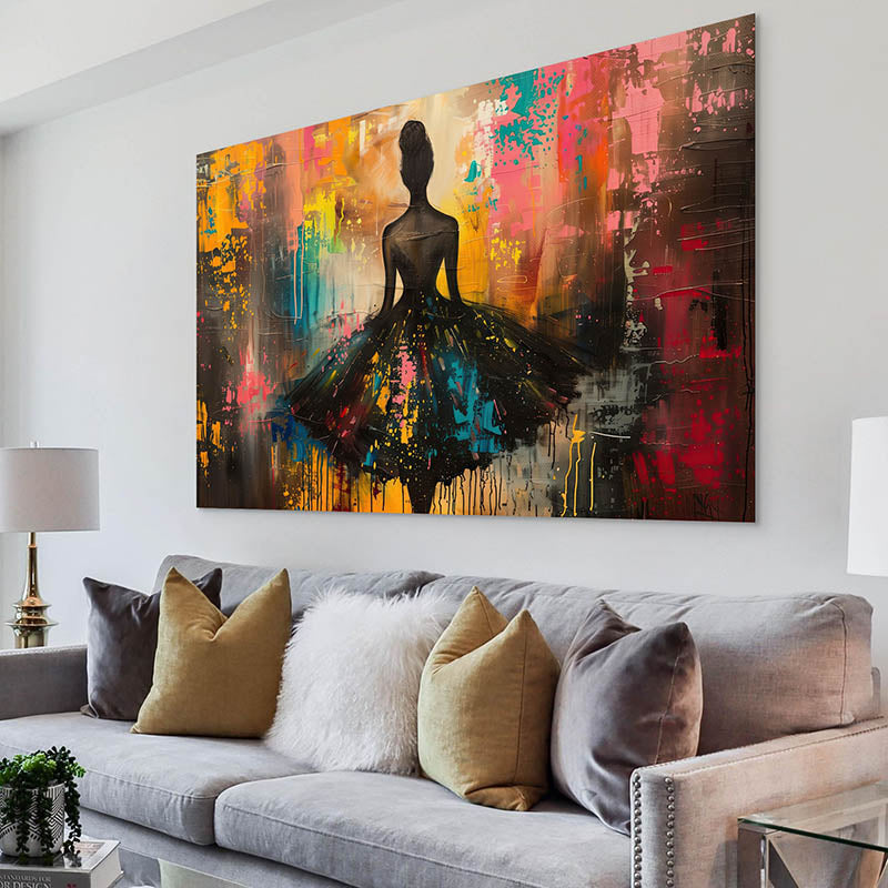 “Gracious Abstraction” è molto più di un semplice dipinto, è una vera e propria opera d’arte che cattura l’essenza dell’eleganza femminile in uno stile decisamente contemporaneo. La silhouette scura ed elegante della donna si staglia su uno sfondo vibrante di tocchi vivaci e colorati. Tocchi di giallo, blu, rosa e arancione si fondono per creare un'atmosfera energica e armoniosa. Questo dipinto è ideale per chi desidera trasformare il proprio soggiorno in uno spazio sofisticato e stimolante, dove ogni sguardo scopre una nuova sfumatura o una nuova emozione.