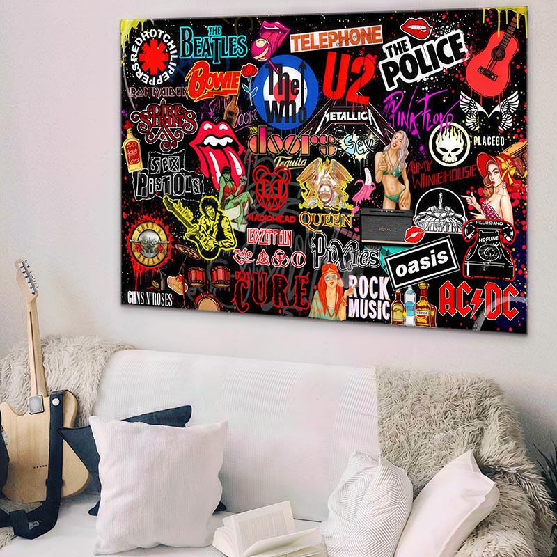 Rock'n Roll ass net nëmmen e musikalesche Stil, et ass eng richteg Kultur déi Dausende vu Fans ronderëm d'Welt verbënnt. Rock ass eng Passioun, et ass e Liewensstil. Dës Welt huet eis eenzegaarteg Momenter ginn, sensationelle Musek, monumental Albumen, mä virun allem legendären Rock Gruppen. Dëst Leinwandmolerei gëtt eis en Iwwerbléck iwwer all déi grouss Nimm, déi d'Geschicht vum Rock geformt hunn. Op engem schwaarzen Hannergrond fannt Dir d'Beatles, Guns n Roses, ACDC, The Police, Bowie, Queen, The Who, etc.