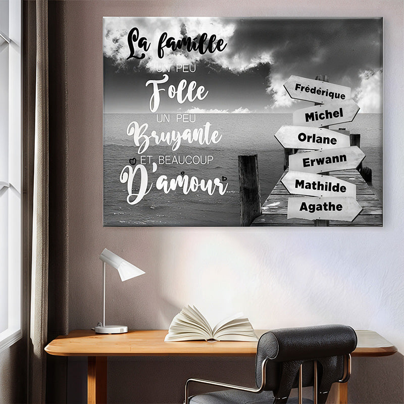 Entdeckt eis personaliséiert Molerei, e richtegt Konschtwierk dat Serenitéit, Flucht a Personaliséierung kombinéiert. Dëse Leinwand weist e Ponton aus, deen iwwer e friddleche Séi erstreckt, ënner engem Wollekegestippelten Himmel, mat enger eenzegaarteger Feature: d'Méiglechkeet 2 bis 10 Virnimm anzeginn. All Detail ass suergfälteg ausgeschafft, och déi éischt Nimm déi Dir gewielt hutt, subtil an artistesch an d'Landschaft integréiert. D'Harmonie vu Faarwen, d'Spill vu Liicht a Schied, an d'Präzisioun vun den Detailer maachen dëst Leinwand e richtegt Meeschterstéck, dat en Touch vun Eleganz a Rou an Ärem Interieur bréngt.