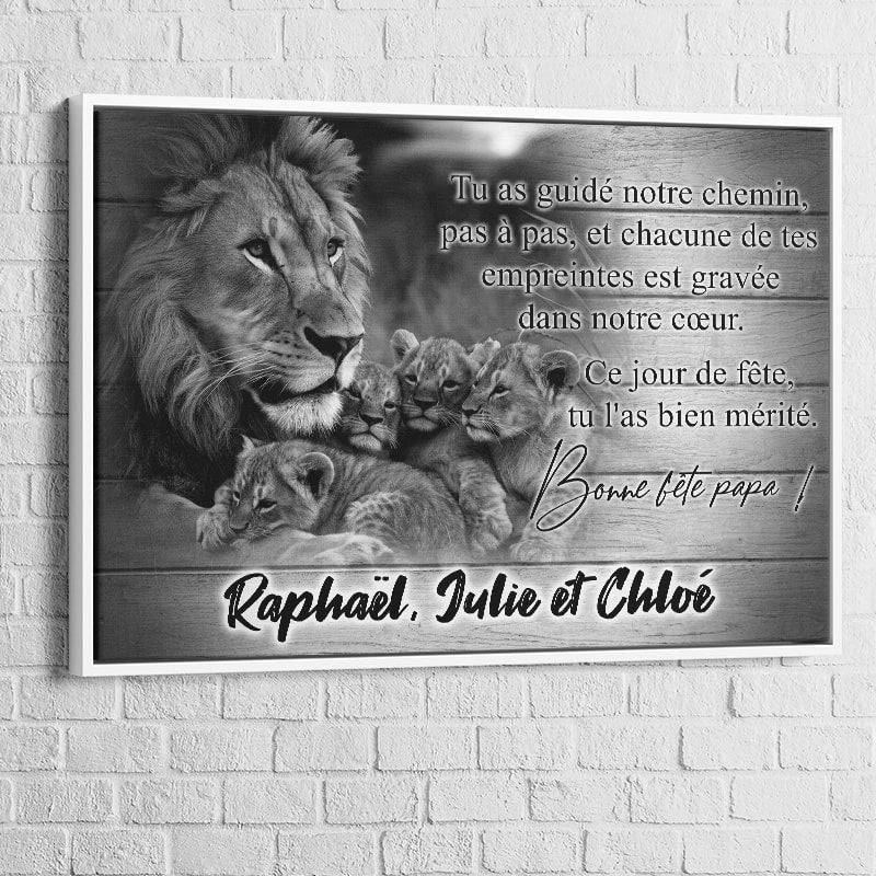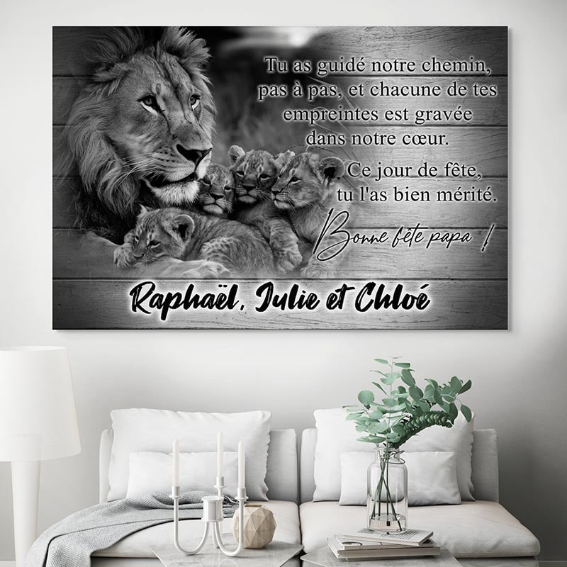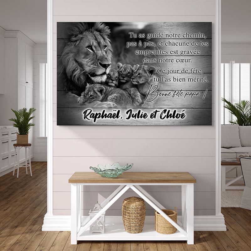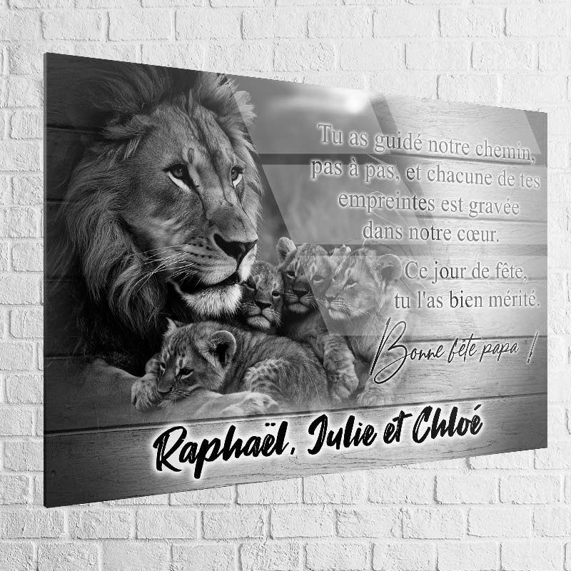 Esta pintura, retratando uma cena tocante de uma família de leões, simboliza proteção, amor e orientação paterna. Os detalhes intrincados e a representação emocional fazem desta uma peça central impressionante para qualquer casa. Personalizável com até seis primeiros nomes, é a escolha perfeita para celebrar sua família e os laços únicos que os unem.