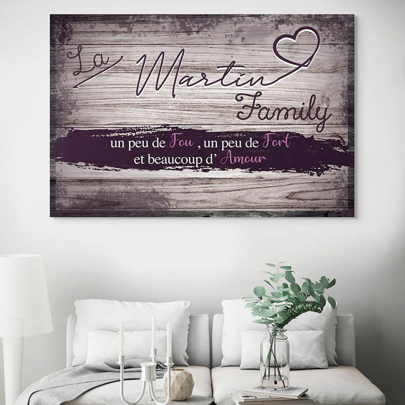 Le Tableau Personnalisé Family est bien plus qu'une simple décoration murale. Il incarne les valeurs et l'esprit de votre famille, immortalisés à travers un design élégant et personnalisé. Vous avez la possibilité d'inscrire votre nom de famille, ainsi que des phrases qui reflètent parfaitement votre cocon familial, comme celle-ci : "Un peu de fou, un peu de fort et beaucoup d'amour". C’est une manière charmante de mettre en avant ce qui rend votre famille unique tout en ajoutant une touche chaleureuse à votre intérieur.