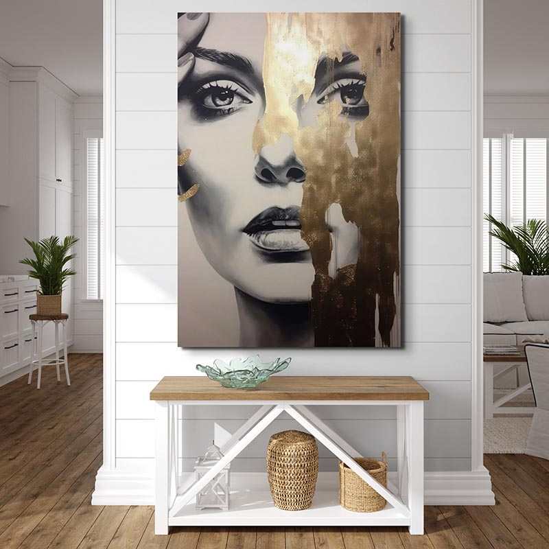 Korosta sisustustasi käyttämällä Moderni maalaus aura of Glamour, silmiinpistävä kangas, jossa kultaiset sävyt yhdistyvät nykyaikaiseen mustavalkoiseen muotoiluun. Herkkä yhdistelmä realistisia yksityiskohtia ja kultaisia yksityiskohtia luo a Nykyaikainen kangas joka korottaa mysteeriä ja viehätysvoimaa. Tämän taideteoksen jokainen kasvonpiirre huokuu eleganssia, kun taas kultaroiskeet lisäävät hienovaraista kiiltoa. Tässä huolellisesti kehystetyssä maalauksessa on a visuaalinen vaikutus voimakas, joka muuttaa minkä tahansa tilan taiteelliseksi pyhäköksi.