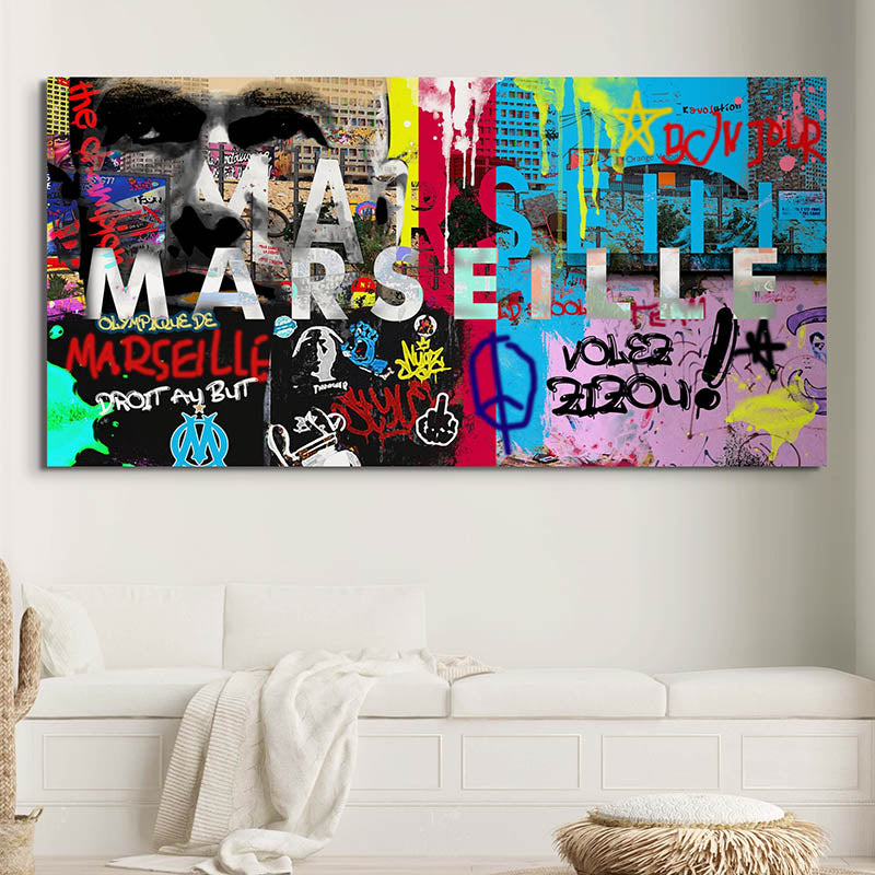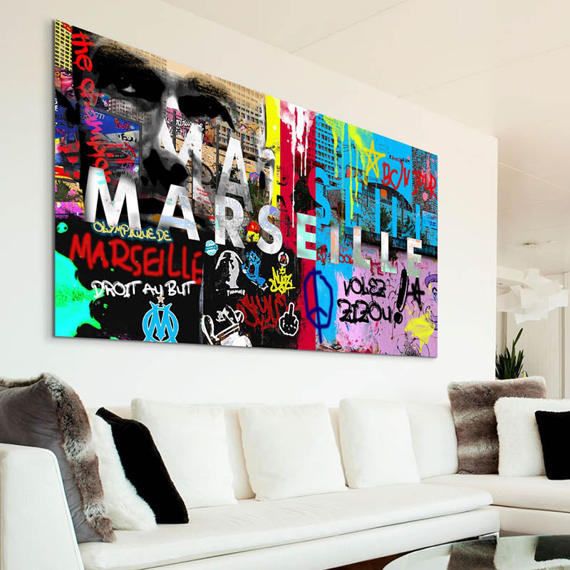Caratterizzato da colori vivaci, graffiti urbani ed elementi iconici di Marsiglia, questo dipinto cattura la vitalità della città. Si adatta perfettamente a diversi stili d'interni: